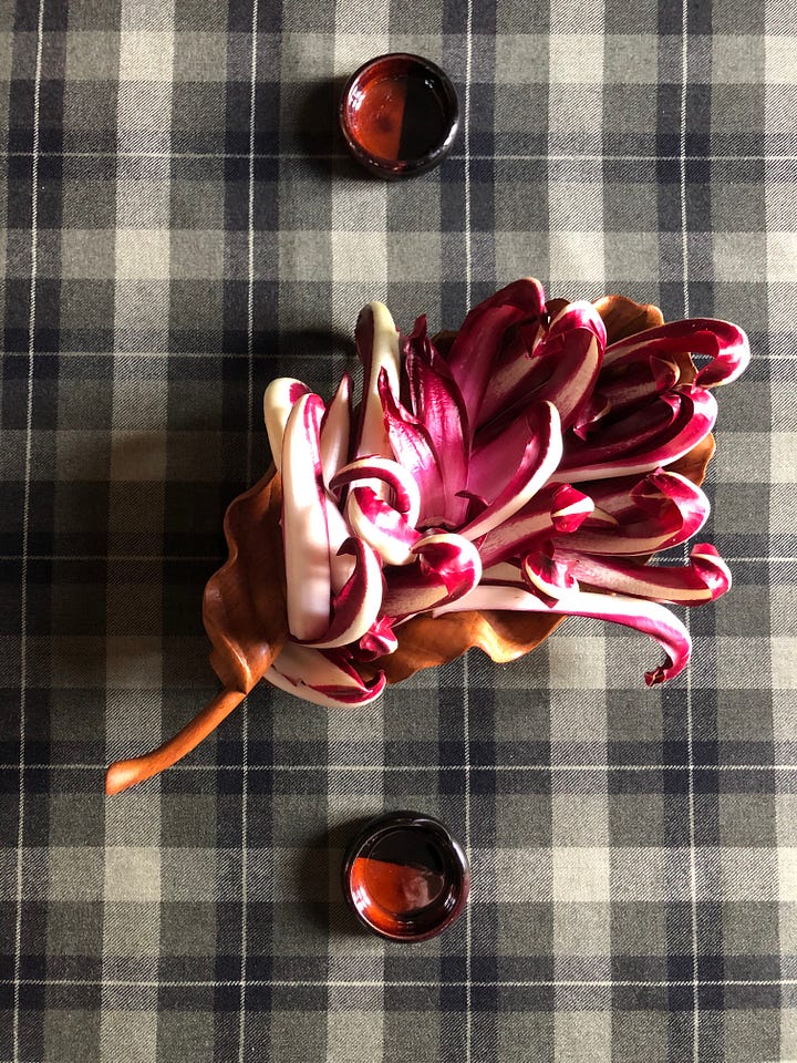 Scelgo verdure più facili da preparare. Premessa, io non uso insalata in busta. Due cespi di radicchio sono davvero facili da pulire-lavare-condire. Il condimento lo prepari una volta alla settimana e lo tieni in frigorifero. Preparo una vinaigrette emulsionando dapprima un cucchiaio di mostarda di Digione con un cucchiaino di miele (d’acacia), un cucchiaino di sale e due cucchiai di aceto di vino bianco o rosso (ottimo anche l’aceto di lamponi) e poi, sempre sbattendo, unisco a filo 6-7 cucchiai di olio extra vergine d’oliva. E quando ne ho bisogno è già pronto. Per variare, la settimana successiva preparo lo stesso condimento sostituendo l’aceto con succo di agrumi.