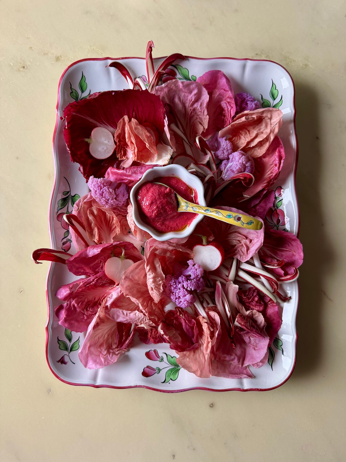 Essendo iniziata la stagione delle barbabietole, e al mercato trovo quelle già cotte in forno, sotto la cenere, le acquisto per farne un contorno (tagliate a fette e condite) o un piatto completo unendo dei fagioli cannellini già cotti e della rucola. Oppure la frullo con olio e sale (eventualmente erba cipollina, a volte aggiungo delle ricotta o caprino) e ho un altro condimento per l’insalata. Qui con altrre verdure crude, ben messe nel piatto di portata.