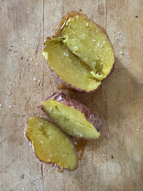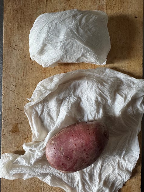Uso tutti molto di più il forno a microonde. Forse te lo ricordi, lo menziono spesso, trovo che il “soffritto veloce” sia un grande alleato: dopo aver preparato un trito (cipolla, sedano, carota) lo metto in un vasetto di vetro, copro con olio extra vergine d’oliva, dopo 1- 1 1/2 di cottura alla massima potenza le verdure avranno rilasciato l’acqua di vegetazione e i sentori aromatici, trasferiti nell’olio. Proseguo, se necessario un altro minuto (dipende dalla quantità). E una volta raffreddato, il soffritto può essere conservato, ben coperto, in frigorifero, anche una settimana. Quando lo metto in pentola, lo cuocino ancora qualche minuto, prima di aggiungere altri ingredienti come la carne per un ragù. Un altra grande preparazione è quella delle patate “al cartoccio”. Le lavo bene, le punzecchio con i rebbi di una forchetta, le avvolgo con carta assorbente bagnata e strizzata.