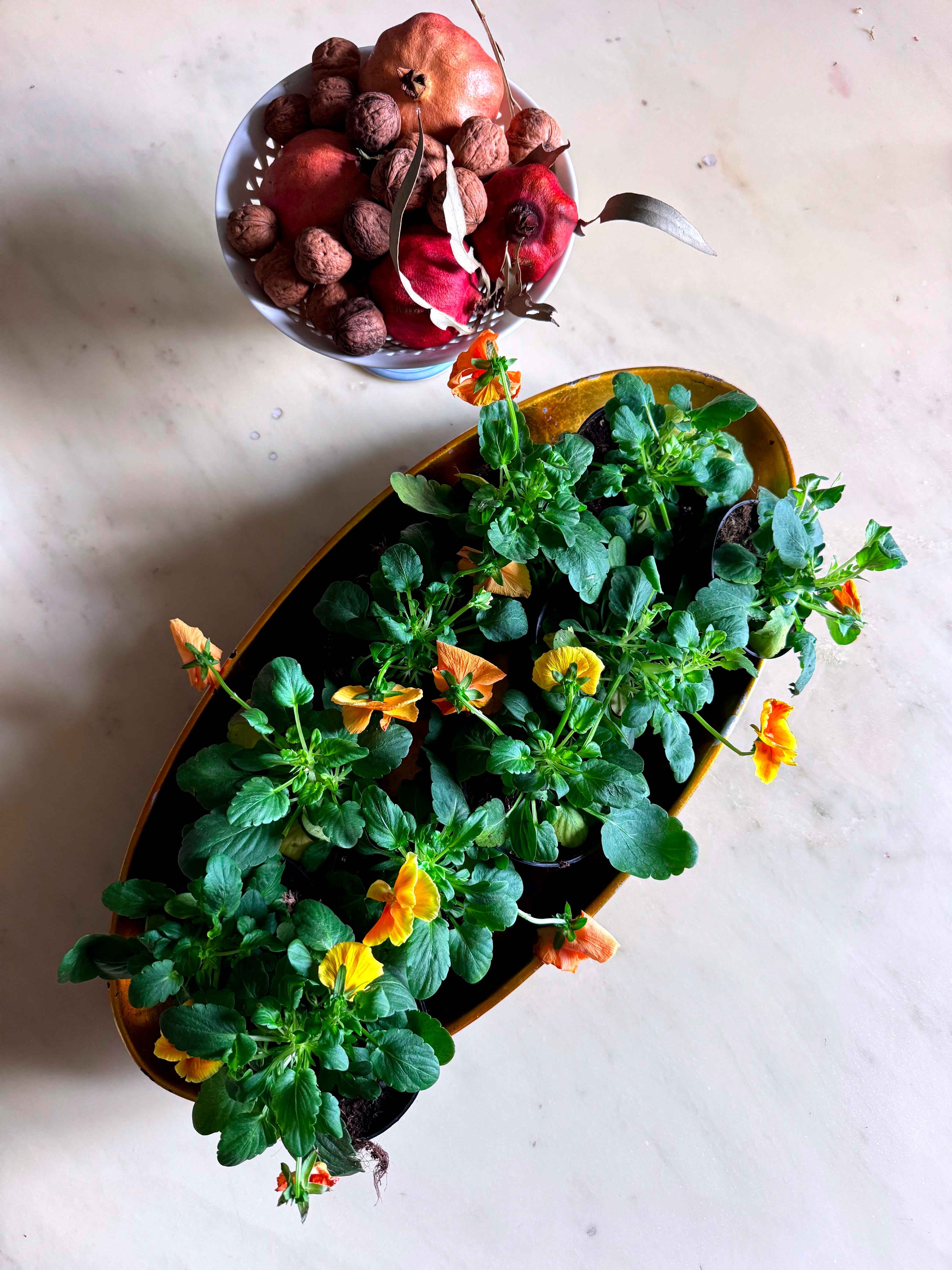 E se anche tu sei in un periodo intenso, che dirti… forza e coraggio! Circondarci di bellezza, perché fa sempre un gran bene. Bastano piccoli gesti per riavere l’armonia di cui abbiano bisogno. Ieri ho comprato delle piantine di viole gialle, messe in una ciotola, come centro tavola. Ho messo della melagrana insieme a poche noci, delle foglie e bacche. Hanno fatto la grande differenza in questi giorni così caotici. Nei ritagli di tempo, ho sistemato la dispensa. E pulito il frigorifero, togliendo l’inutile. Perché l’ordine fa sempre un gran bene.