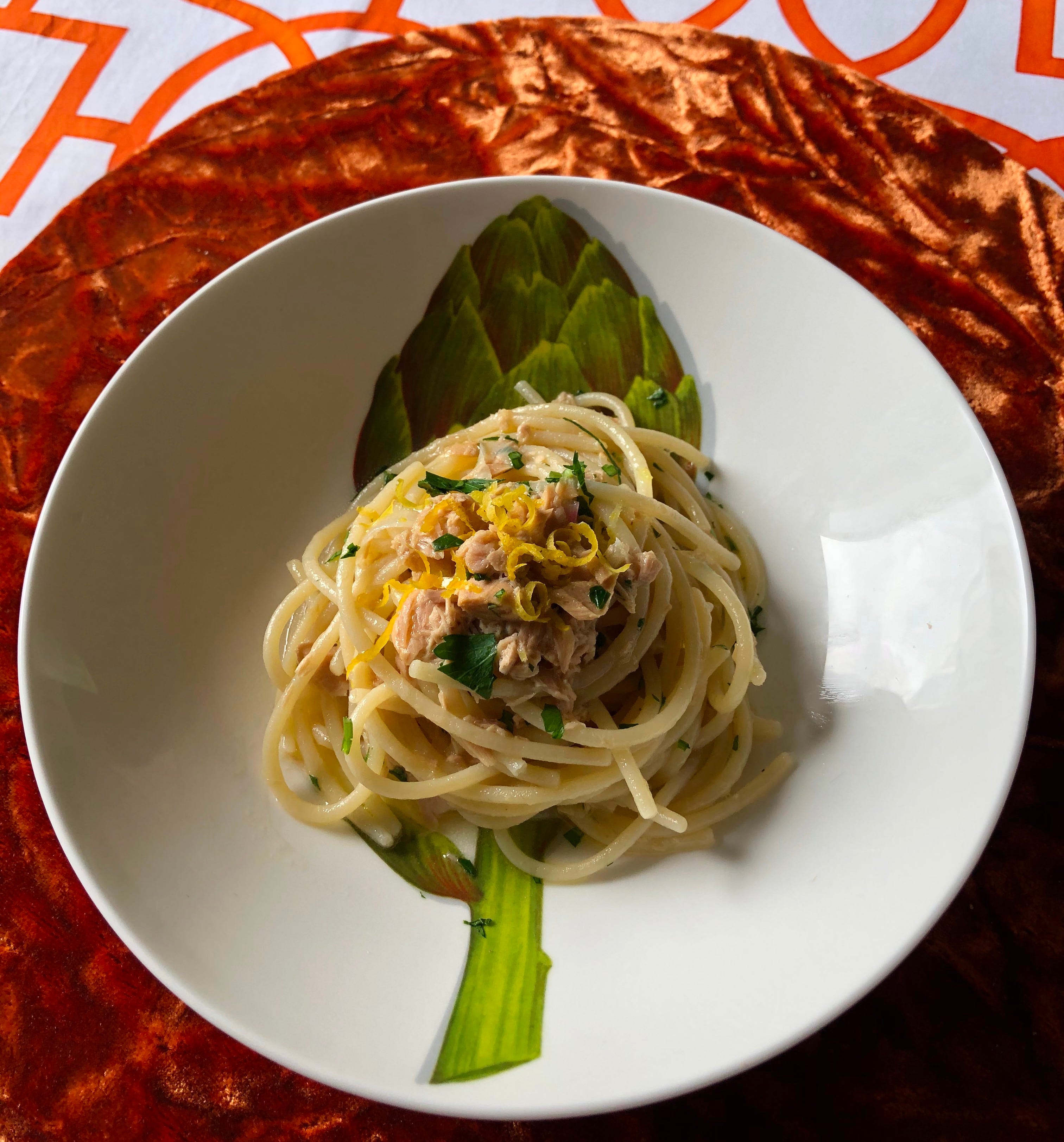 Qui la pasta con tonno e limone. Trovi la ricetta con procedimento tradizione a fondo pagina (tratta dal libro Appunti d’Estate), puoi anche applicare il metodo che ti ho appena descritto.