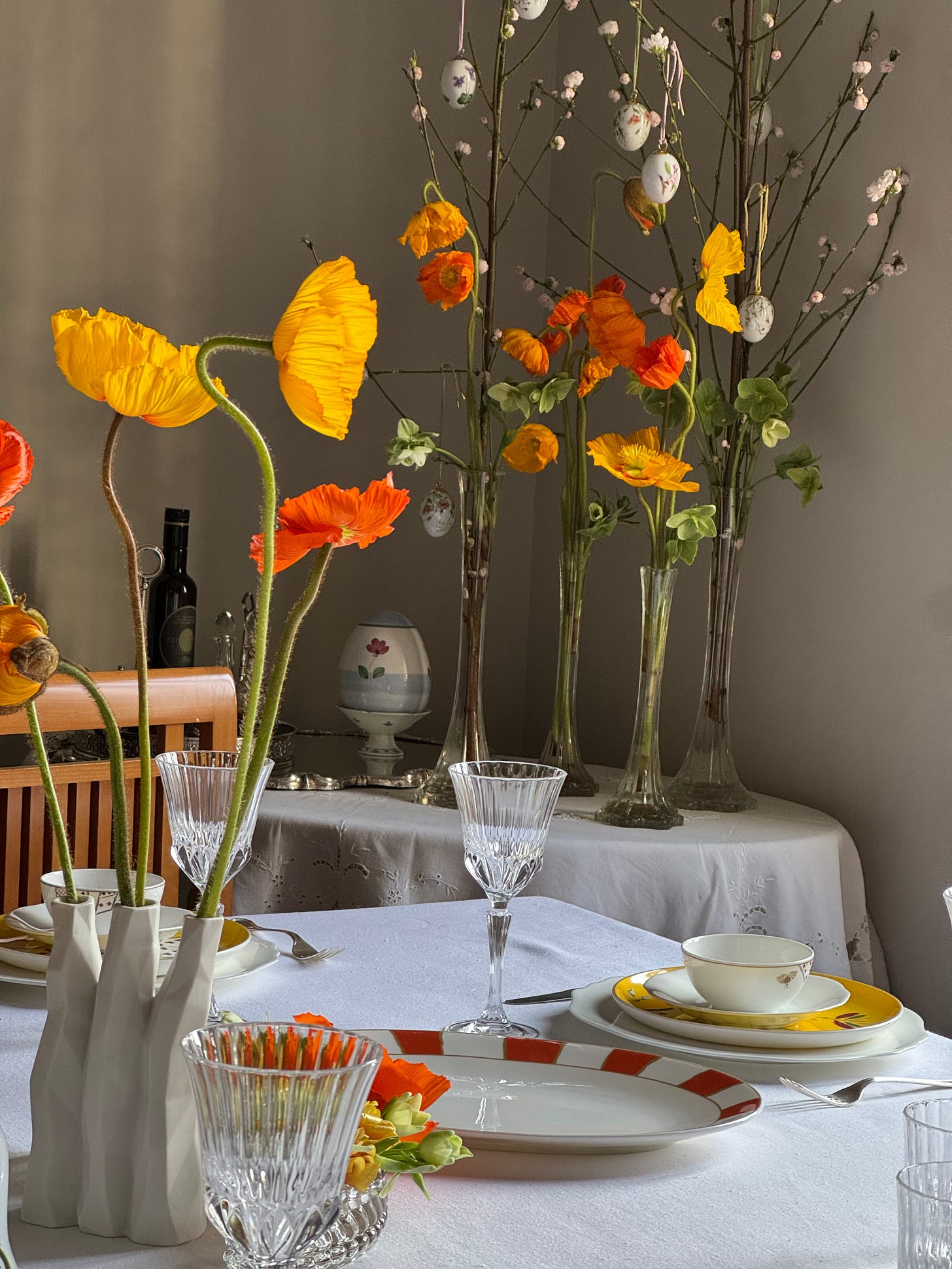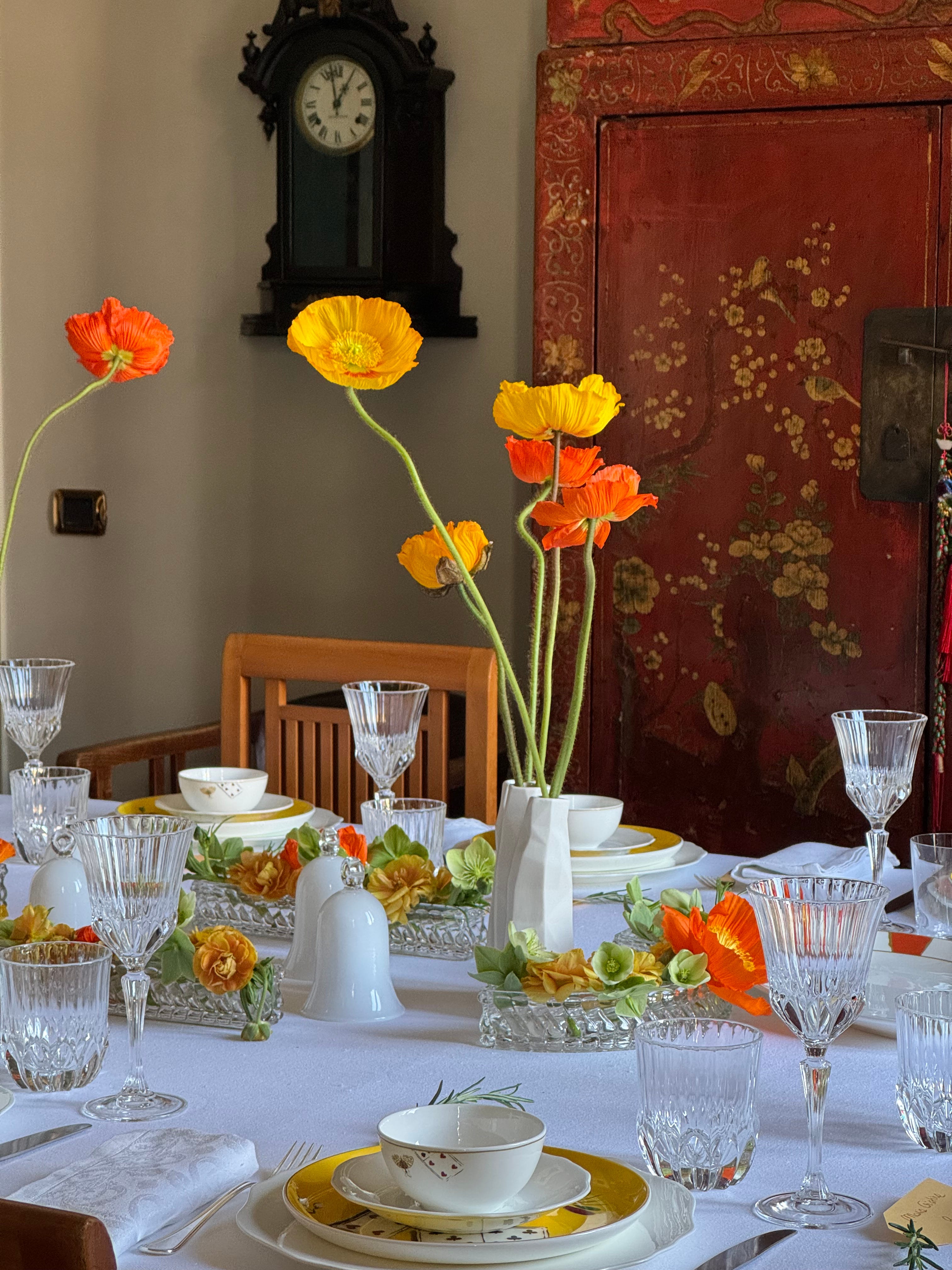 Dunque quest’anno la mia tendenza è giallo e arancio per tavole gioiose. Dai tulipani ai ranuncoli, ai grandi papaveri, che se ben curati resistono più di una settimana (suggerimento: se si vogliono tagliare, è bene fiammeggiare la base).