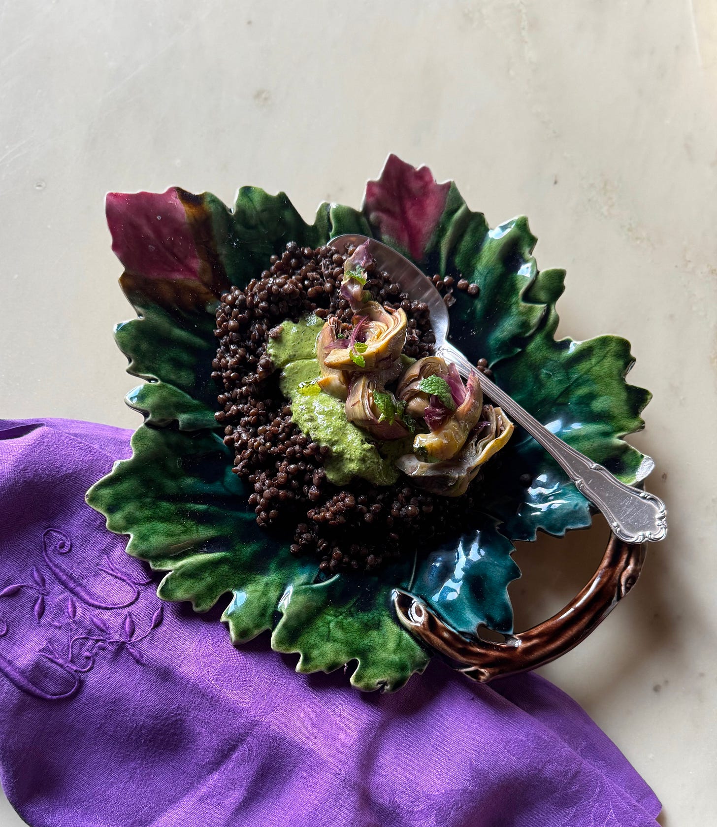 Questo invece è un bel piatto vegetariano che non ha tradizione regionale ma che da tanti anni è spesso nei miei menu per accontentare i vegetariani, insalata di lenticchie e carciofi. Le lenticchie sono cotte al dente, partendo da acqua fredda. Quindi scolate, fatte intiepidire. A parte, i carciofi, tagliati sottilmente e cotti in modo molto semplice, in una base di olio e scalogno o cipolla fresca. E poi “uniti” da una salsa verde a base di prezzemolo, capperi, olio - in abbondanza - e un’ acciuga. Un piatto che sorprende sempre.