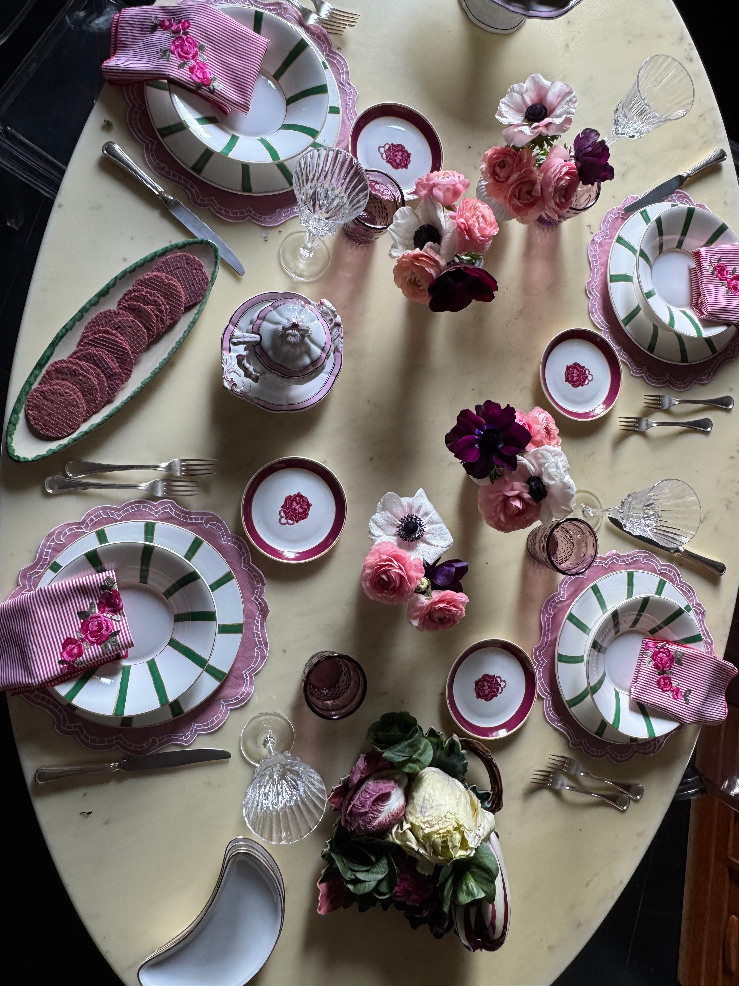 Spesso spezzare un colore base con un altro può essere un’ottima scelta, sopratutto se ti piacciono i contrasti. Qui, ad esempio, al rosa predominante ho unito il verde dei piatti. E verde-rosa è abbinamento sempre vincente.