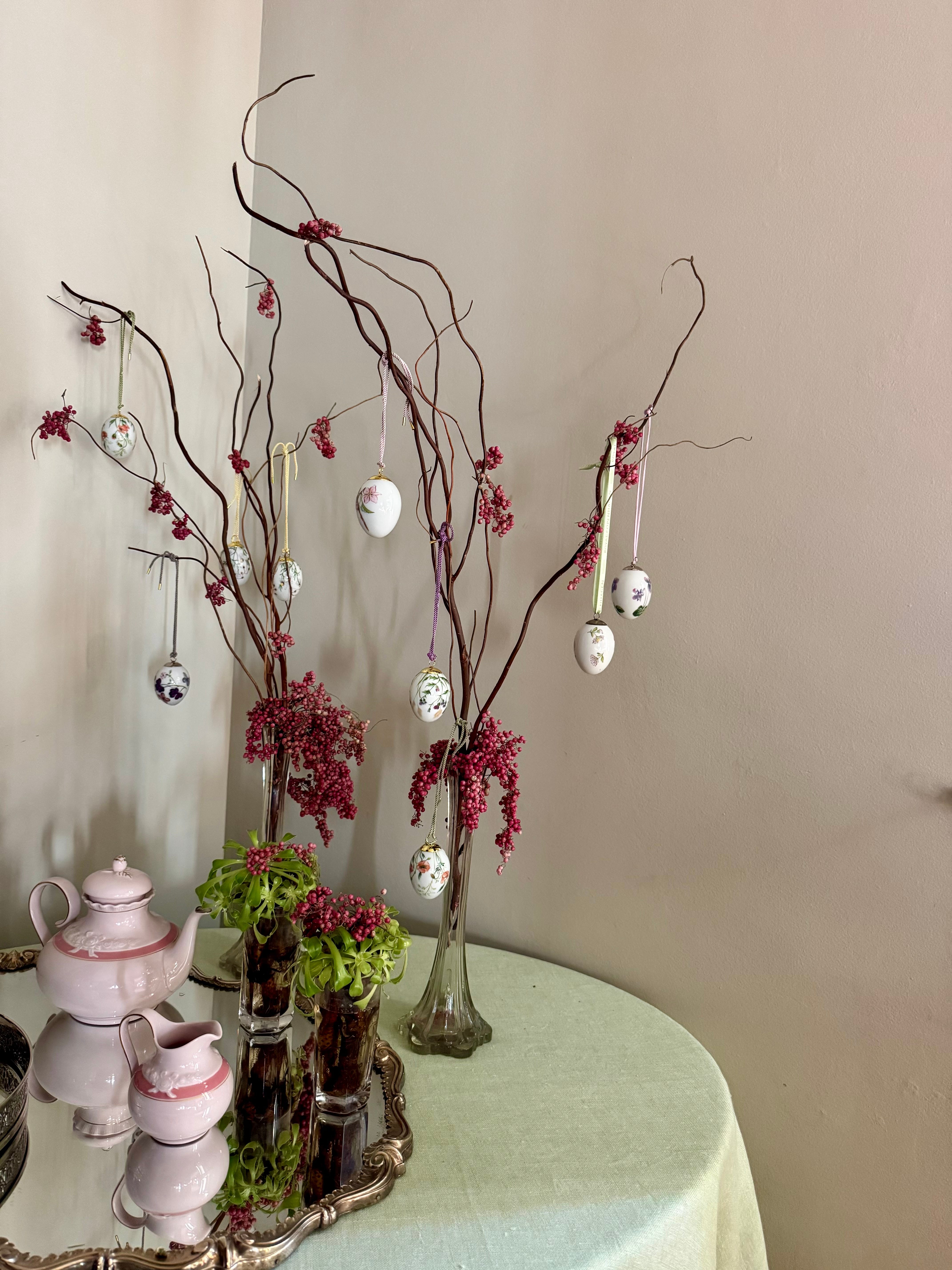 Avete preparato l’albero di Pasqua? Io quest’anno ho cambiato due volte i colori. La scorsa settimana avevo addobbato con quello che avevo in casa: qualche ramo insieme a quello stesso pepe rosa che hai visto più volte. Ce l’ho da Natale e di tanto in tanto lo rimetto in uso. Quando non ho fiori freschi, mi bastano delle piantine grasse insieme a rami di pepe rosa (come vedi in foto) per avere subito quell’idea di “giardino” che dall’esterno entra in casa.