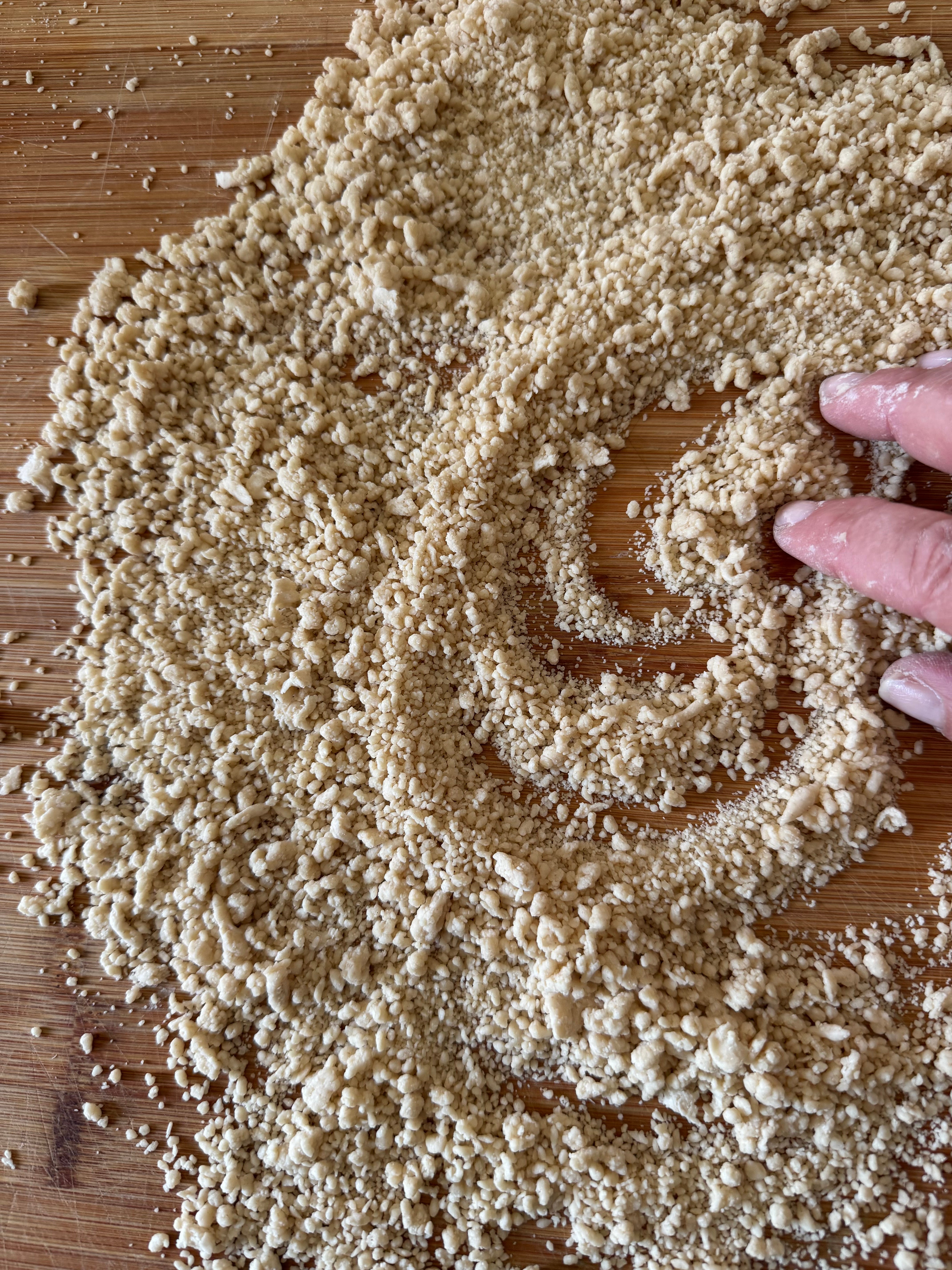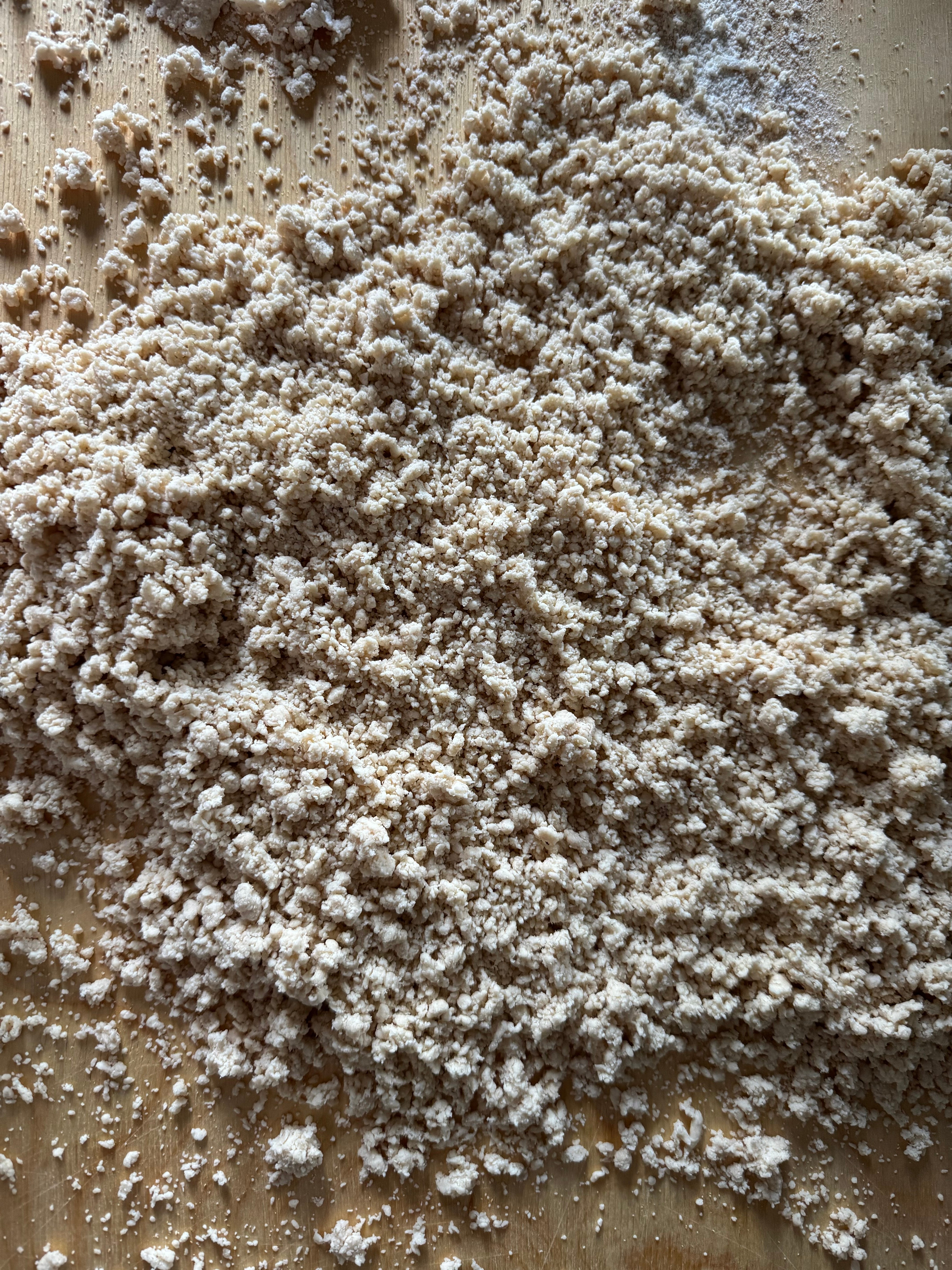 Spargere su una spianatoia la farina, quindi spruzzare sopra acqua calda con le mani o con la “frasca” (può essere utile un pennello) così da formare dei piccoli grumi.
