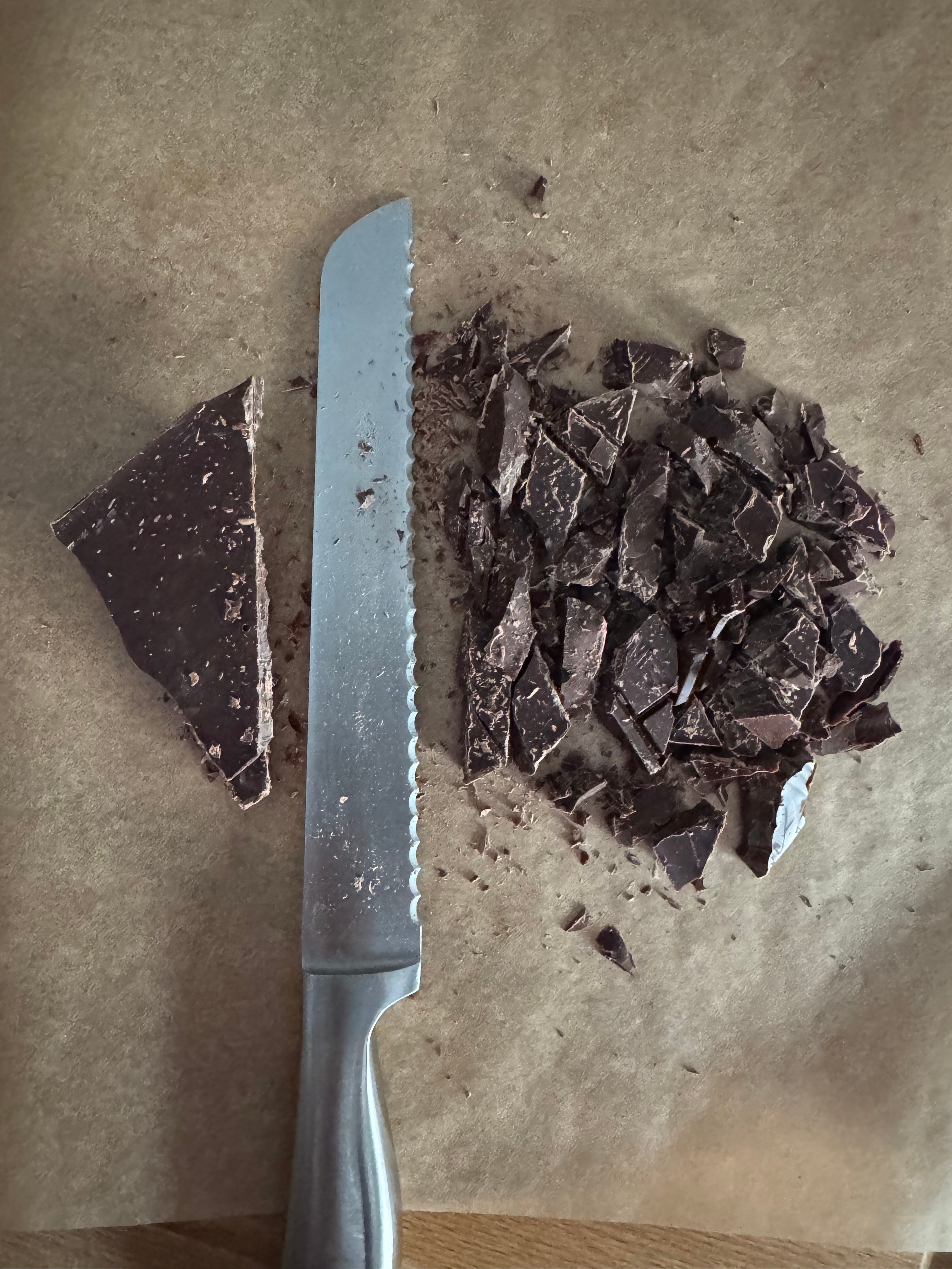 Ah dimenticavo! se devi spezzettare il cioccolato a mano, ti consiglio di usare un coltello a seghetta. Non farlo direttamente sul tagliere, ma adopera un pezzo di carta forno. Quante volte quei pezzetti di cioccolato si si sono sciolti e rimasti attaccati al tagliere o… ?