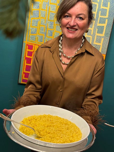 Cosa ho preparato? Un buffet goloso al mattino, poi nel pomeriggio ho cambiato il setting delle tavole e allestito un aperitivo che si è trasformato in una piccola cena con un piatto caldo, confortevole e avvolgente, come lo è il risotto con lo zafferano (quello Dop dell’Aquila!).