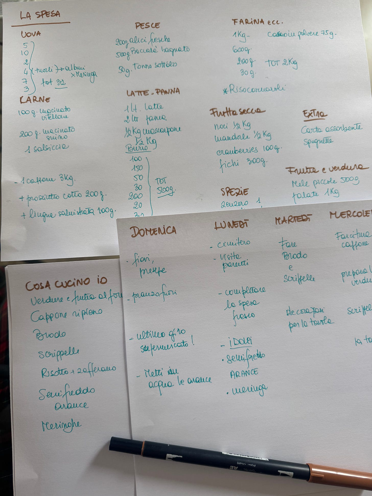 La spesa, ben ragionata è fondamentale per un’economia di tempo e perché se qualcuno viene delegato, abbia istruzioni più chiare possibili. Prenditi del tempo per fare questo esercizio: dopo aver stilato il menu, estrapola le ricette, stampale o trascrivile sommariamente. Studiale, per capire la tempistica, così sarà più semplice fare le tue liste e calendario.