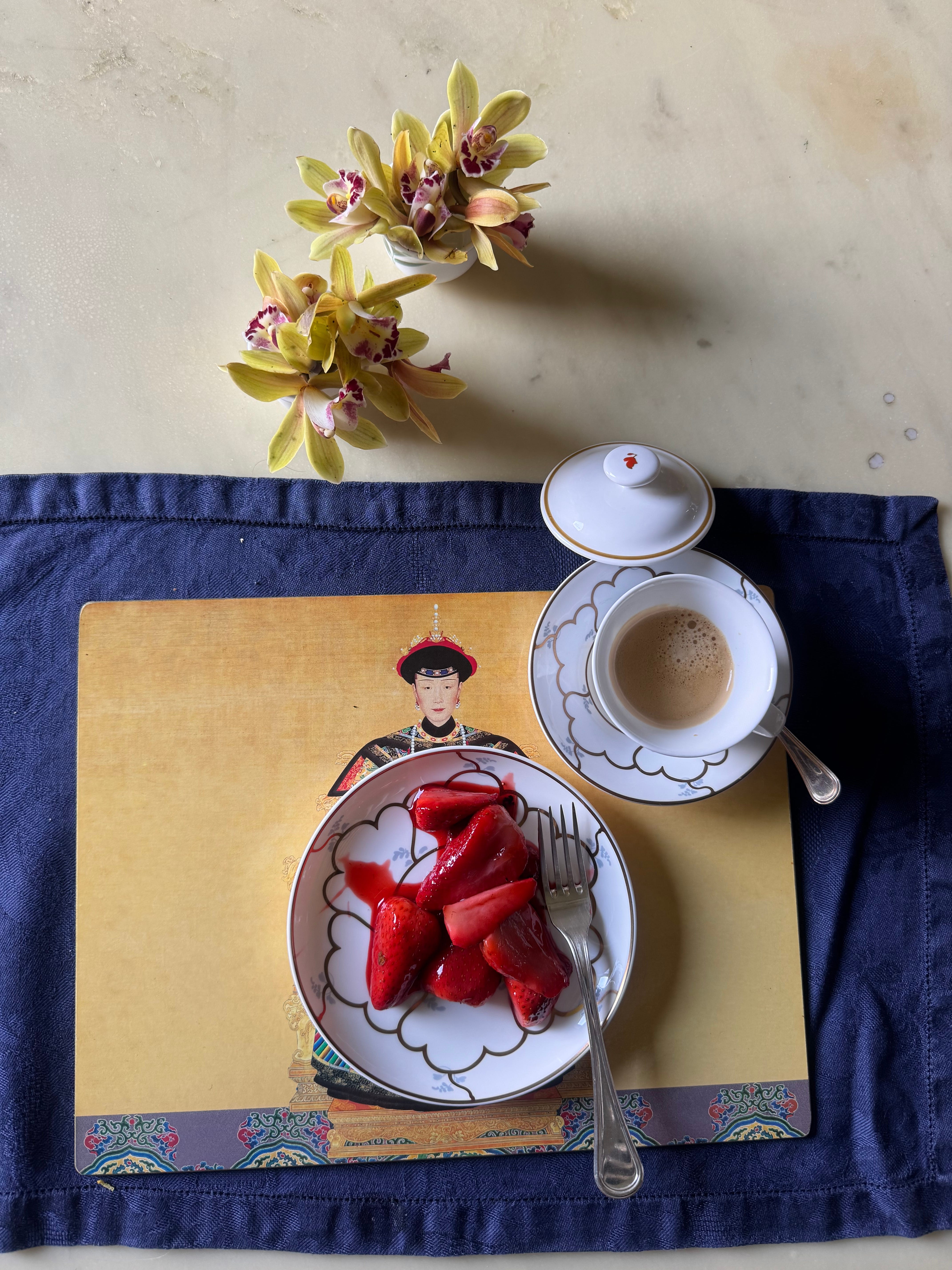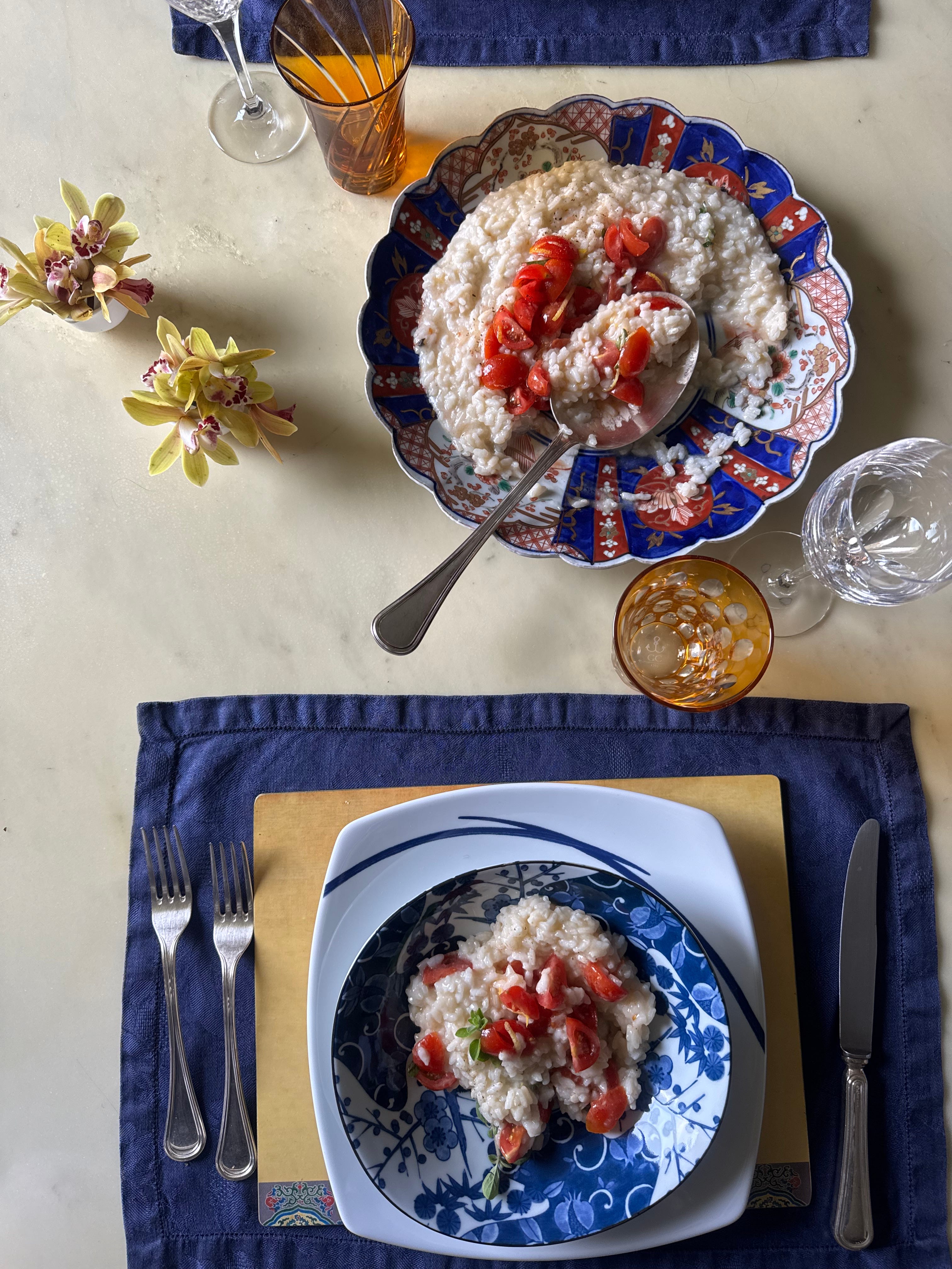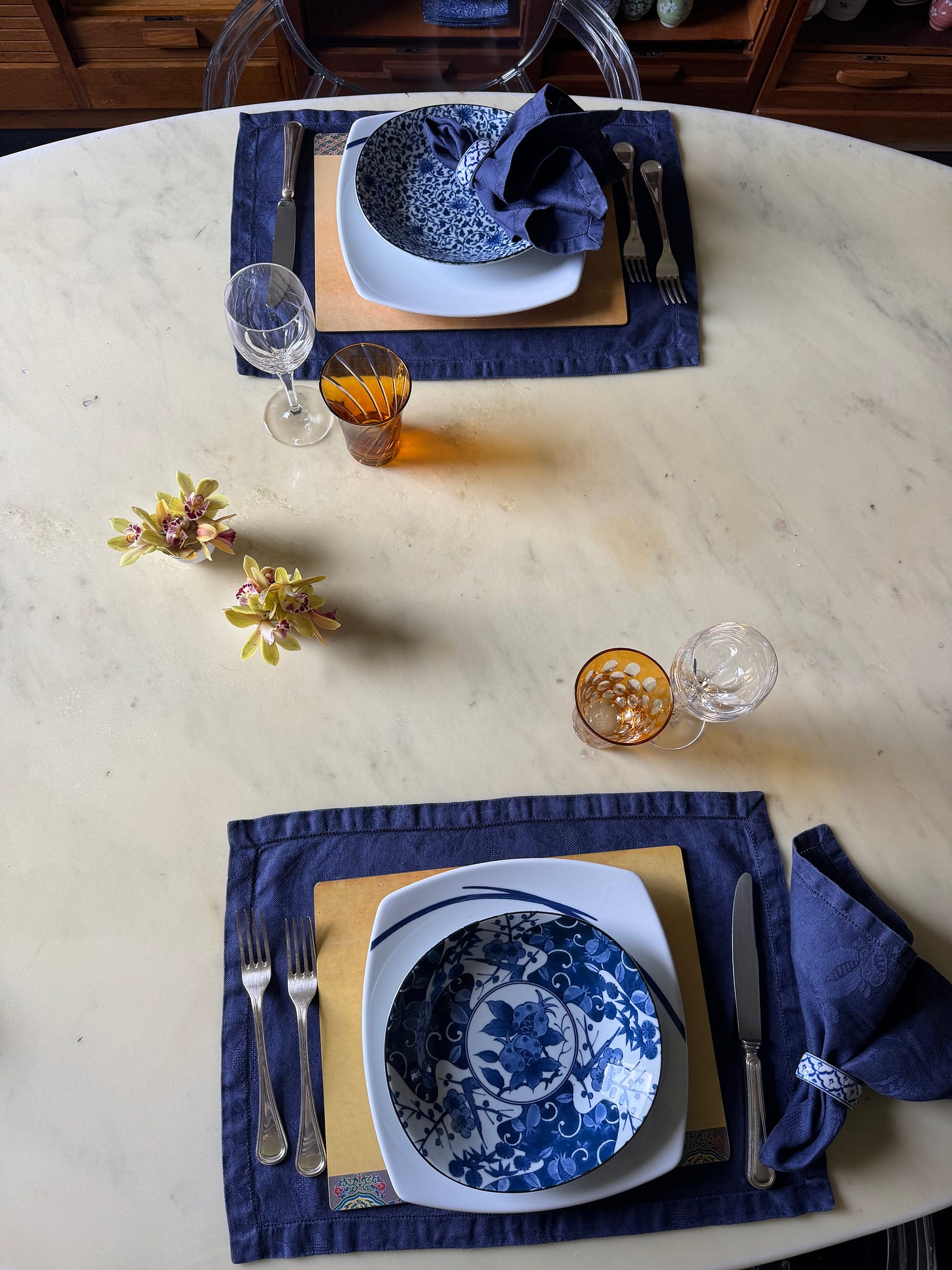 Ho messo un set che avevo pensato tanti, ma proprio tanti anni fa, quando avevo acquistato dei bellissimi placemats con figure cinesi. Troppo piccoli per apparecchiare con un piatto regolare, avevo fatto fare delle tovagliette di fiandra blu (oggi forse risultano un po’ datate, ma va bene così!). Ho messo i piatti quadrati, ai tempi erano una gran novità, e i piatti fiondi giapponesi, hanno un decoro diverso diverso dall’altro…