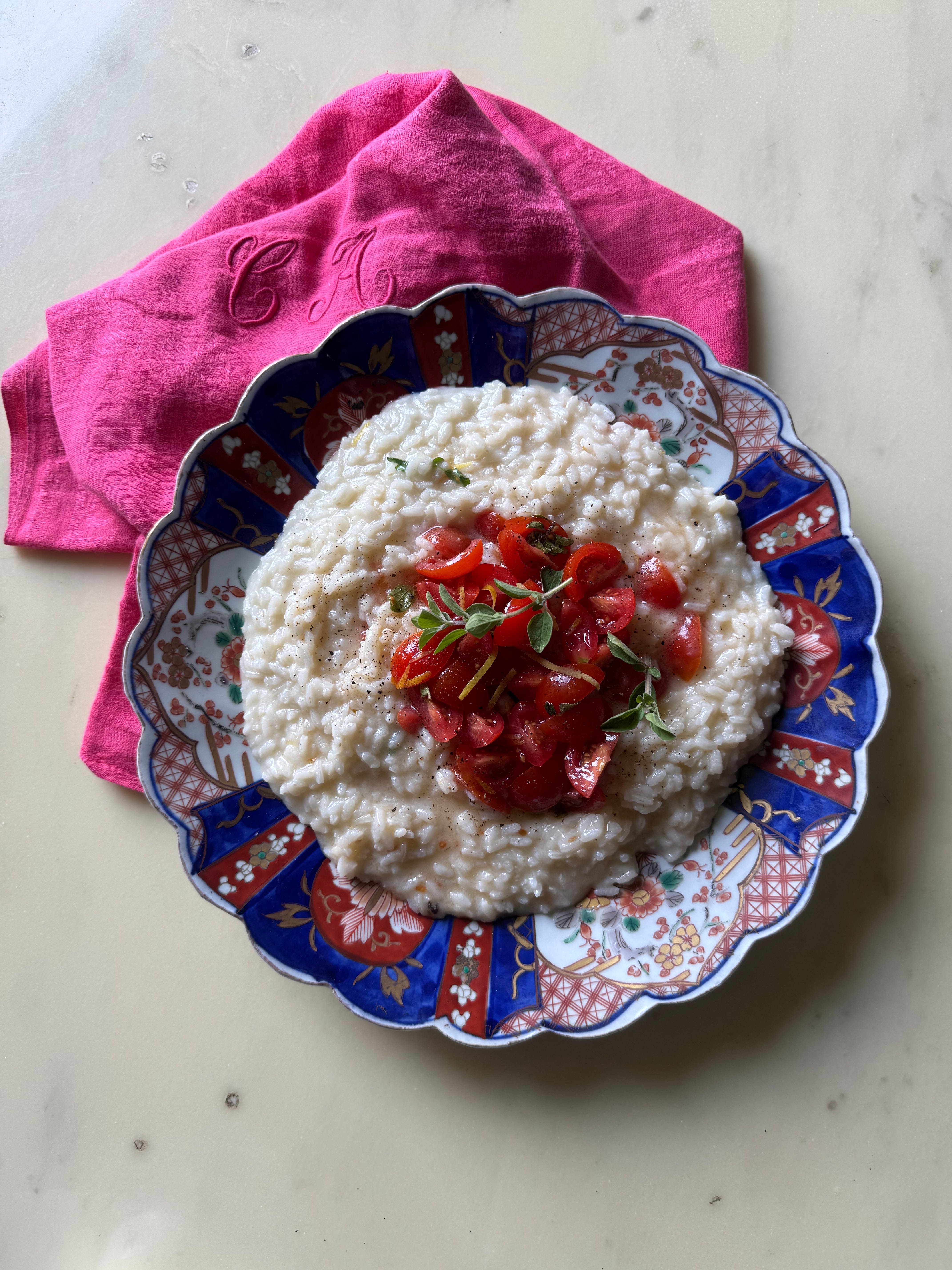 Tecnica di cottura diversa dal riso bollito, dunque tecnica del risotto. E solo a fine cottura una mantecata con olio (quello con cui ho condito i pomodorini). In più, tante erbe aromatiche e un po’ di scorza di limone.