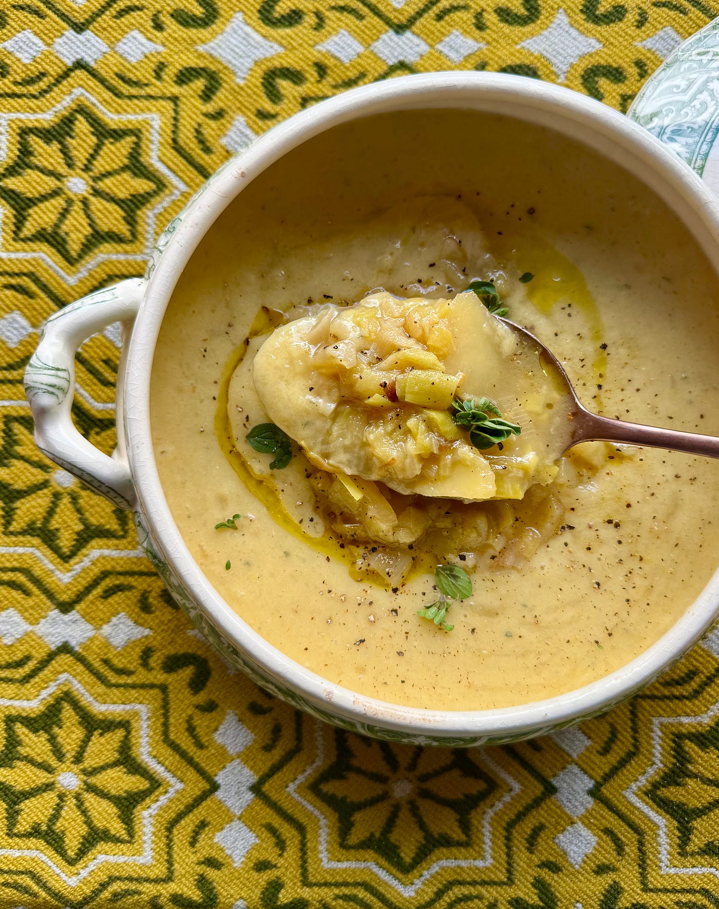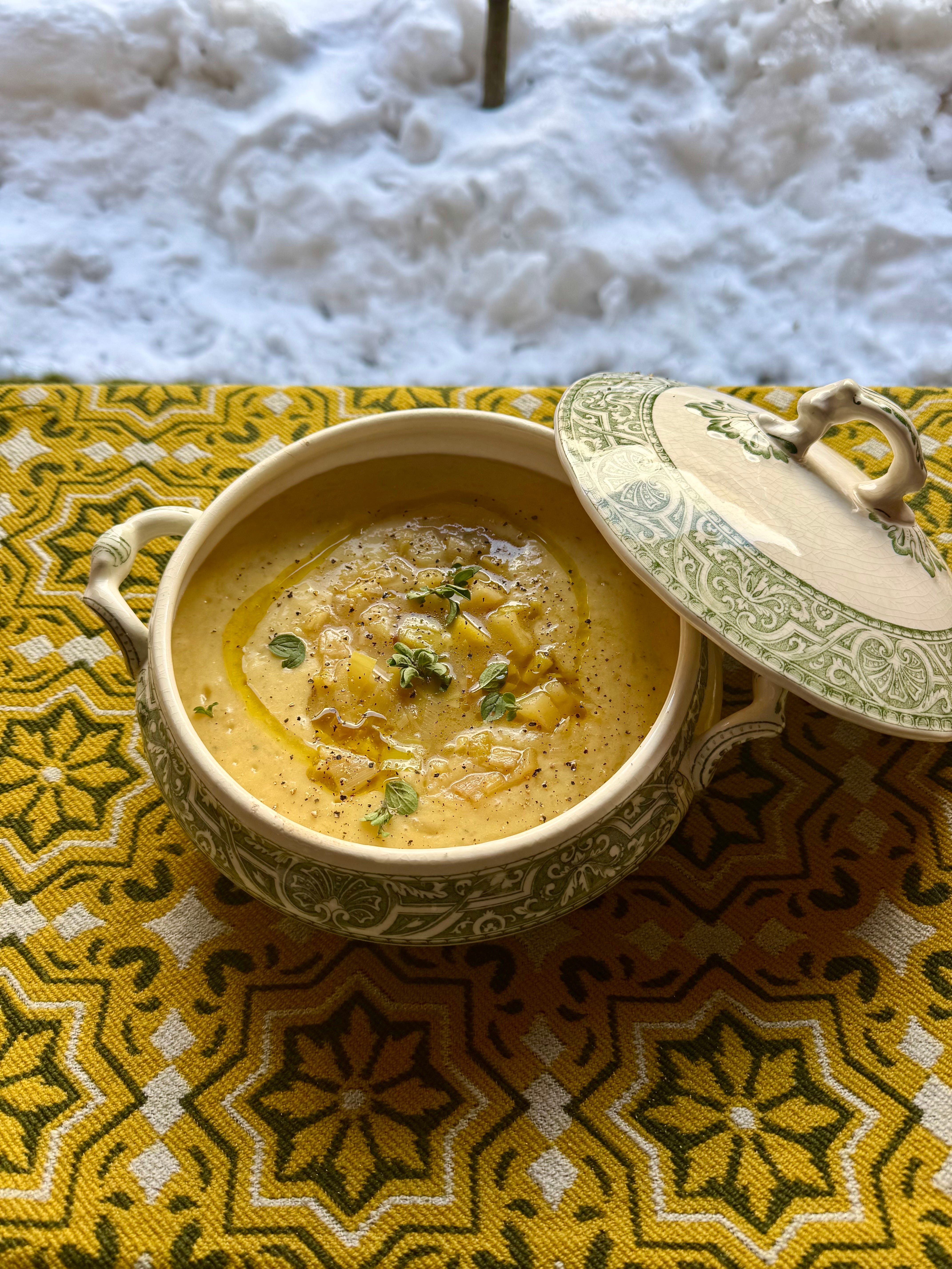 Con gli scarti di due porri, insieme a una crosta di grana e qualche pomodoro secco ho preparato il brodo, cotto in pentola a pressione, dopo il primo fischio, 15 minuti. Intanto in una casseruola ho scaldato la parte bianca di quattro porri di media dimensione insieme a due cucchiai di olio extra vergine d’oliva. Ho unito tre patate (di media dimensione), tagliate a pezzetti, e un pizzico dei sale. Dopo qualche minuto e una rosolatura dolce, ho aggiunto una foglia di alloro, 1 litro e mezzo di brodo e fatto cuocere per circa mezz’ora, quindi ne ho frullato (brevemente) 3/4. Completato con timo e maggiorana, un filo d’olio e del pepe.
