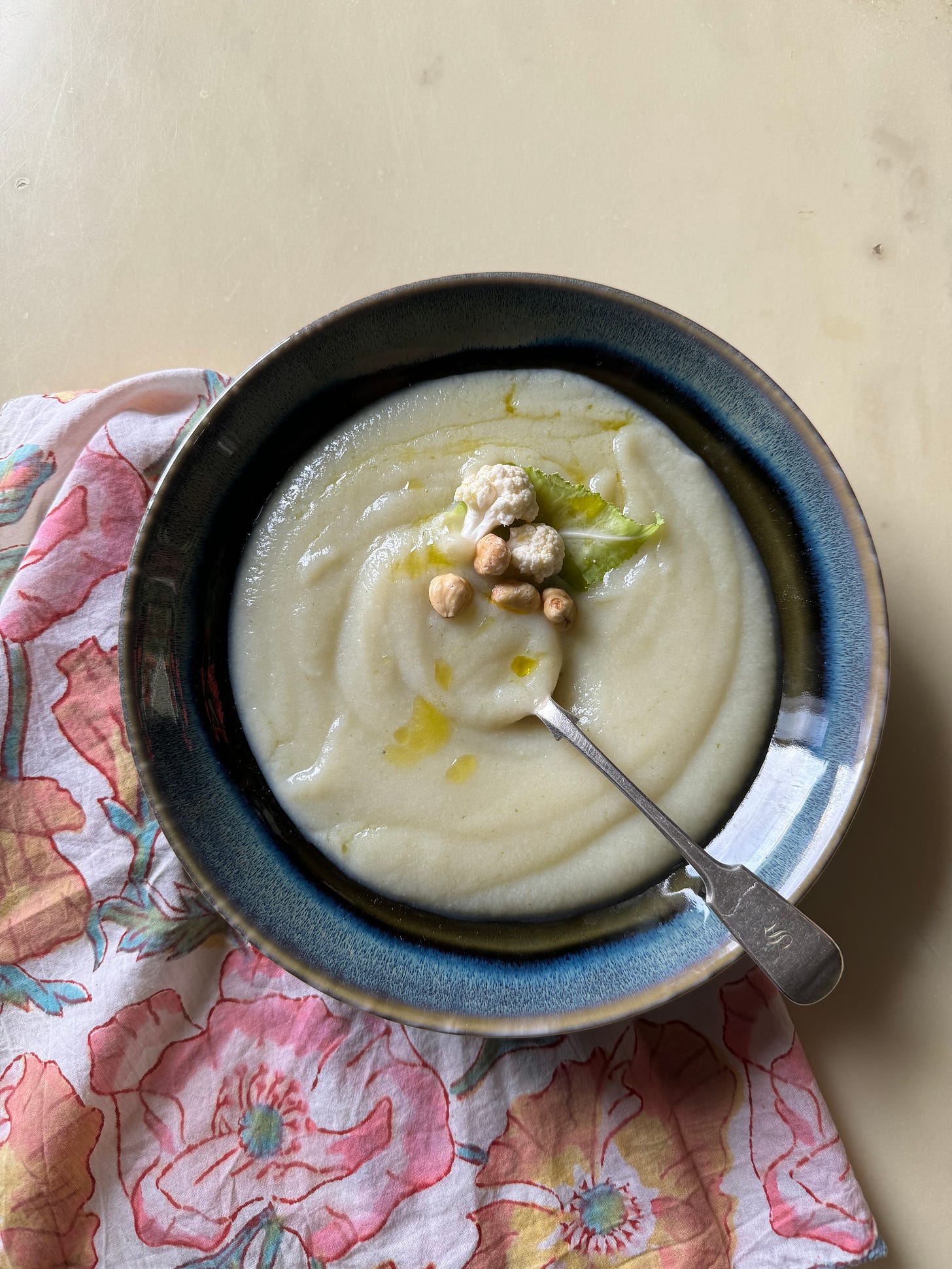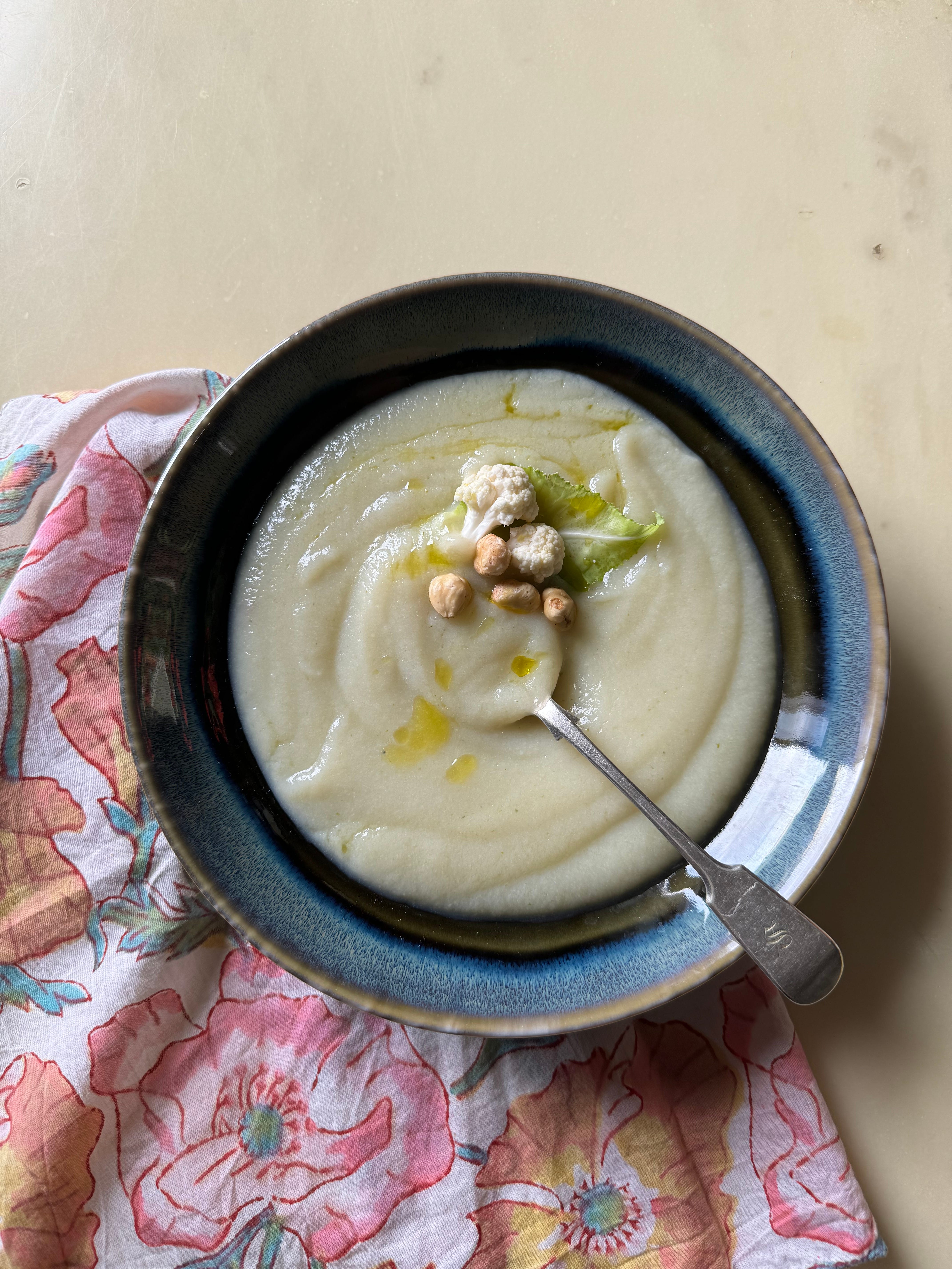 Ho semplicemente cotto in un tegame, coperto, del cavolfiore, con pochissimo brodo e a fine cottura ho frullato aggiungendo a filo dell’olio extra vergine d’oliva, sale e pepe, completando con delle nocciole tostate e un filo d’olio. Una soup veloce, cremosa, molto leggera.